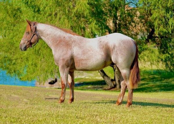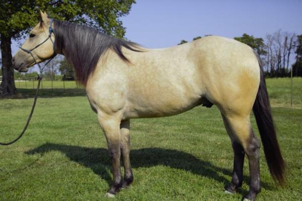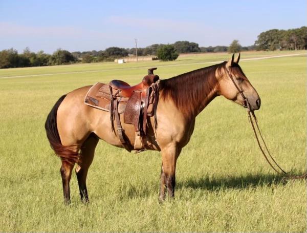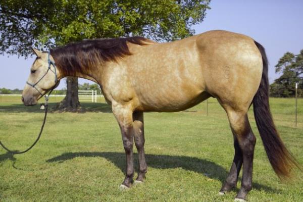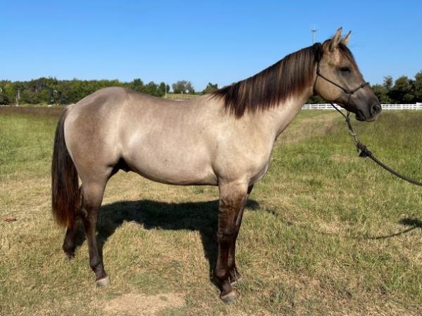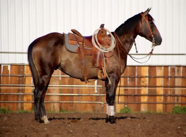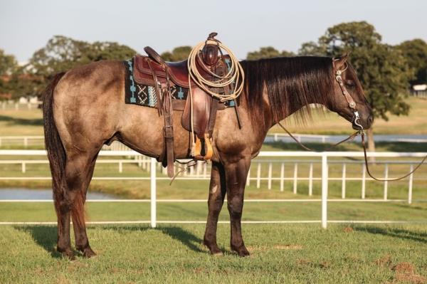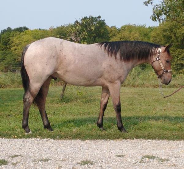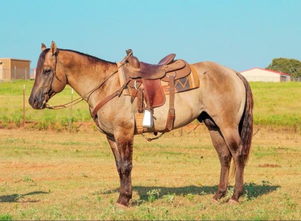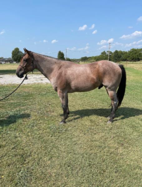 PURCHASED FROM BREEDER. This is a 4 year old, grullo stallion that is a head horse and ranch horse. He has had 120 days heading on him, will have around 150 by sale time. He was started out in ND for a year at a ranch before coming down to TX. Great demeanor, doesn't act like a stallion. Sound, very broke and kids can ride. He is pretty laid back, never had a problem with him. Built, well-behaved and will turn out to be an outstanding rope horse. Will be shown in the team roping preview. FMI (940) 273-2386.