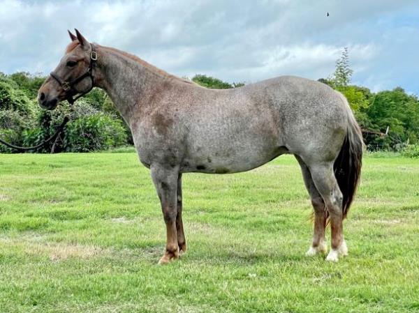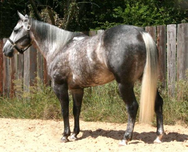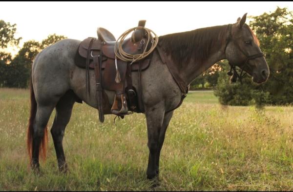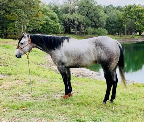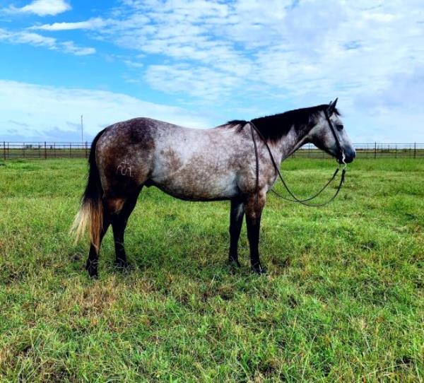 PURCHASED FROM BREEDER. "Freckles" is an eight year old pretty gray gelding that is gentle and broke, broke! He stands 15.2 and weighs 1,275. He is outstanding on ranch trails and is a head horse to boot. He is great in the box and easy in the field. 100% sound. In training with John Hightower. Will be shown in the team roping preview. FMI (979) 571-7001.
