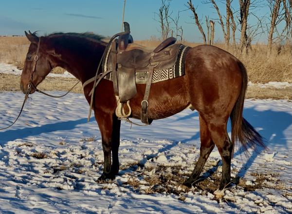 "Cash" is a big, stout, gentle gelding that was started as a 2 yr old by Ivan Raber. He spent most of his 3 yr old year on a ranch in Oklahoma and Texas. He has been used to gather and check cattle. Stated on the hot heels and has tracked calves in the arena. He has had a limited amount of calves heeled on him outside. He is athletic and could go several different directions. "Cash" has been back with Ivan this winter.