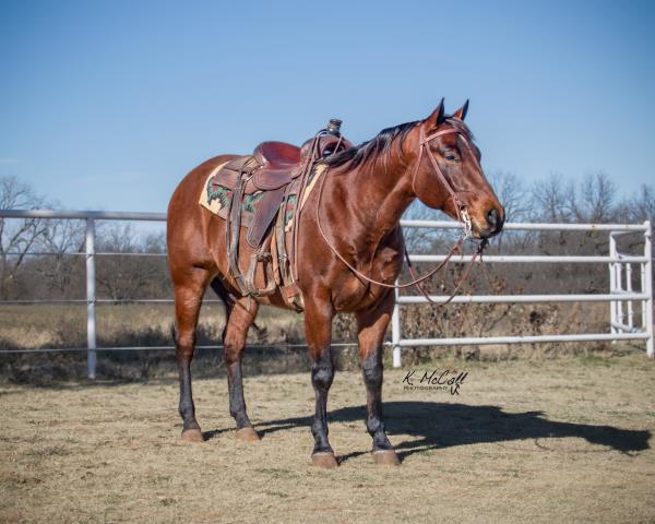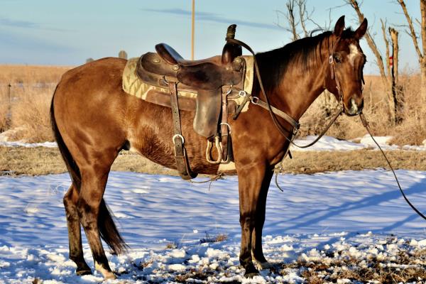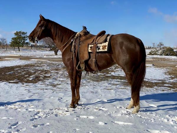 "Pecos" is a quarter draft cross that has done it all on the ranch. He has had a lot of cattle doctored on him and hundreds of calves drug to the fire. He has enough speed to be a pickup horse and he stays gentle. He stands 15.1 hands and is wearing a number 3 shoe. Sells 100% sound.