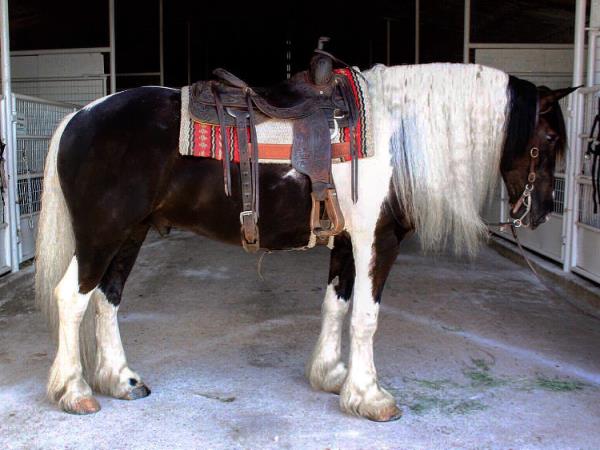 “Fluffy” is a Gypsy Vanner x Friesian gelding. He is a once in a lifetime horse that you don’t want to miss. He is the old trusty you grab up out of the pasture for any job. He is fancy broke with a reining trained foundation. He will spin, stop, circle and switch leads just like a quarter horse. He will lay down, sit up and ride around bridleless. He is the one you want to be mounted on when you have to rope a cow, doctor yearlings, pick up at the rodeo, or carry the flag for the National Anthem. And he even drives! He has been there, done that, and seen it all. This gelding is drop dead gorgeous, fancy, and as broke as one can get. "Fluffy" is the gelding that every horse owner would love to have in their barn. He is 15.2 hands, no vices, clean x-rays, and is an easy keeper.