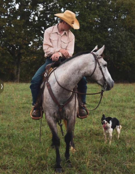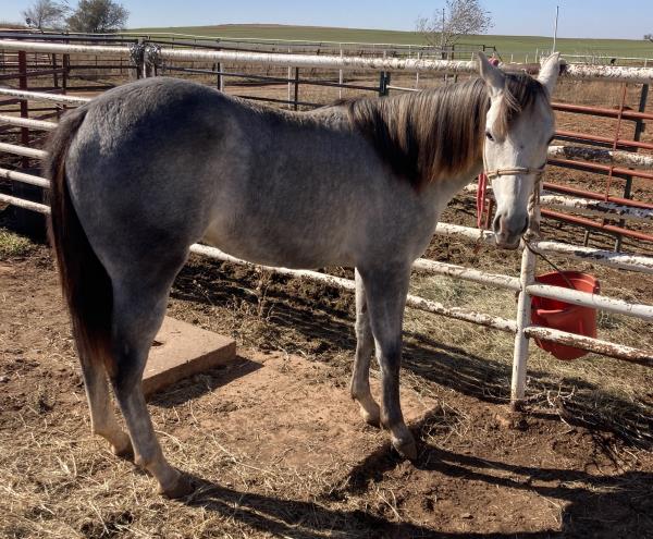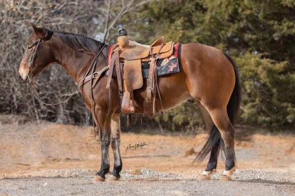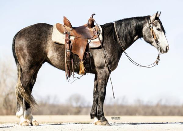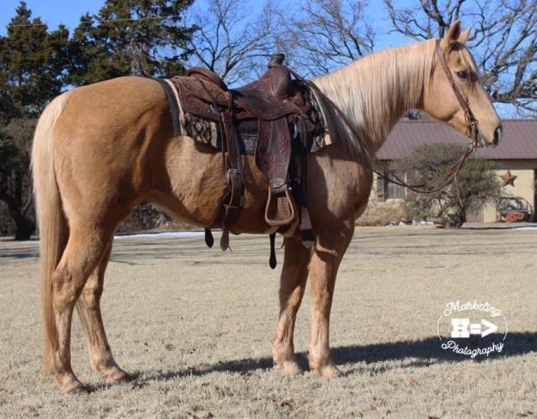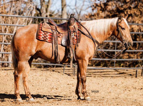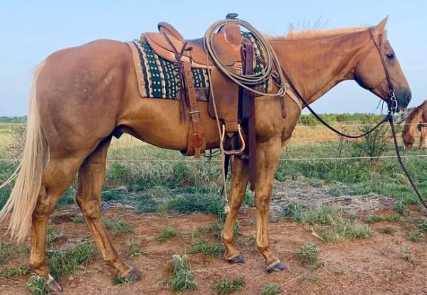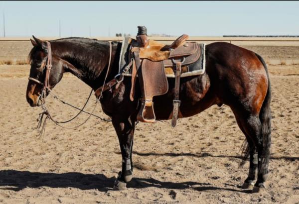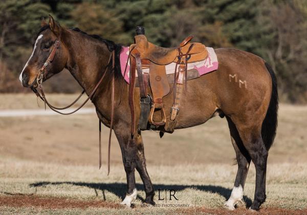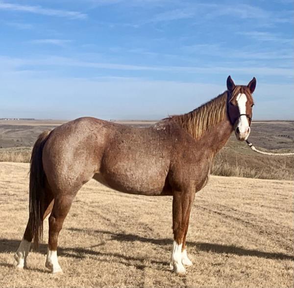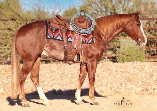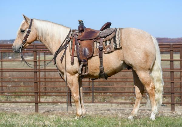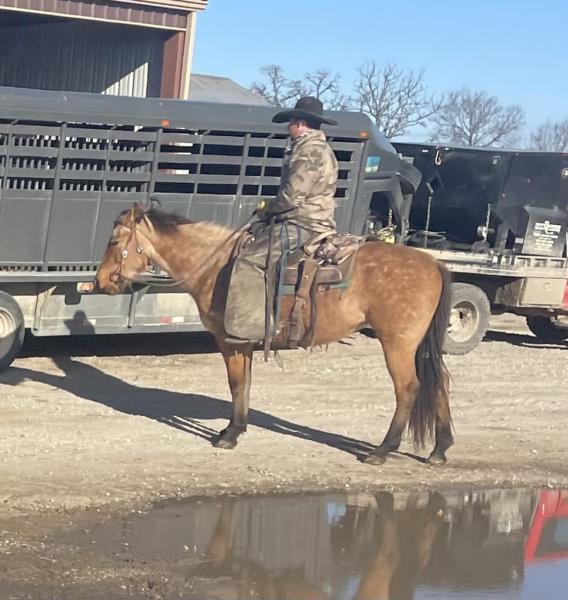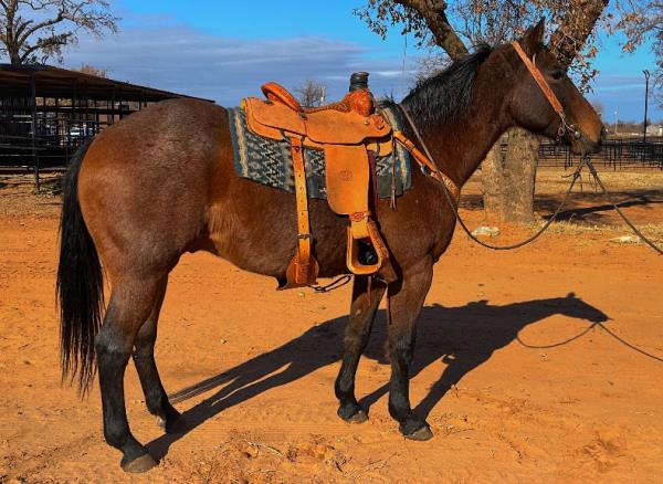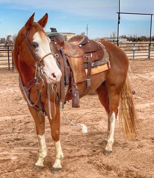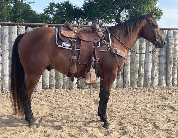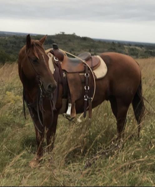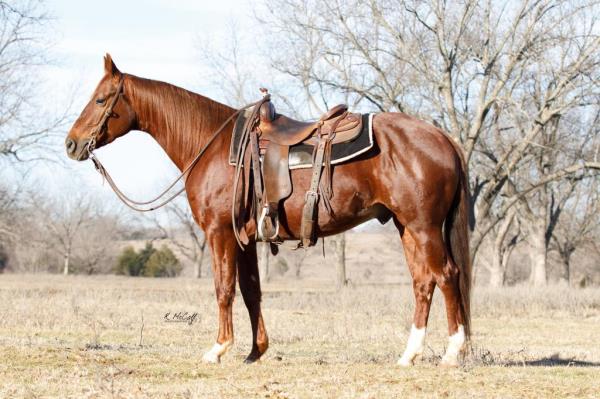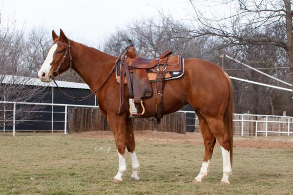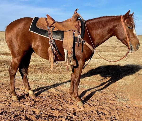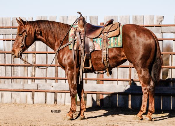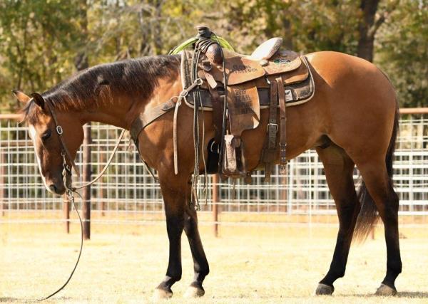 NOTES: This is an awesome prospect with a lot of potential. He has 120 days of riding and is ready to go in any direction, from team roping, cutting to working cow horse. Has been used in and out of the arena from checking and doctoring wheat pasture cattle and shipping at the ranch. I have used him to sort pairs, drag calves in the branding pen, and as a turnback horse at local shows. He has been started on the flag and roping the sled. This gelding is super quiet with no buck.