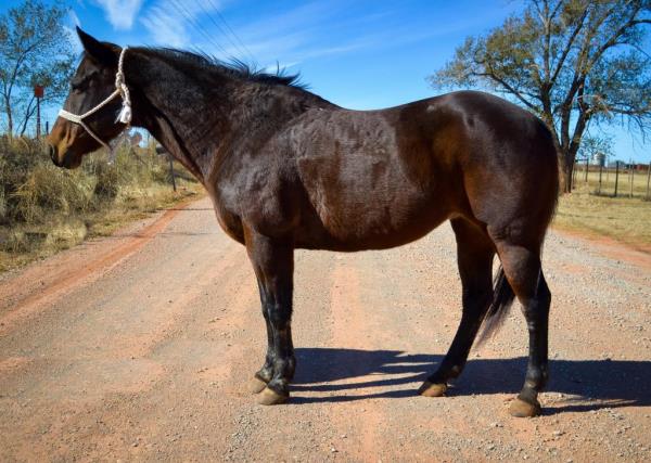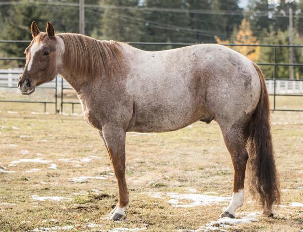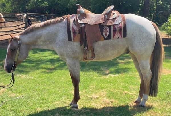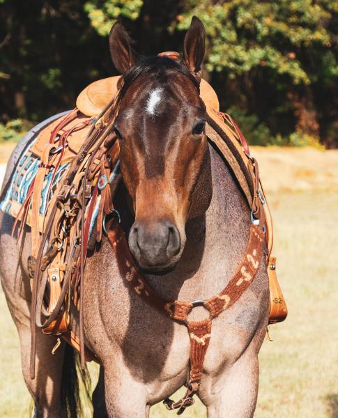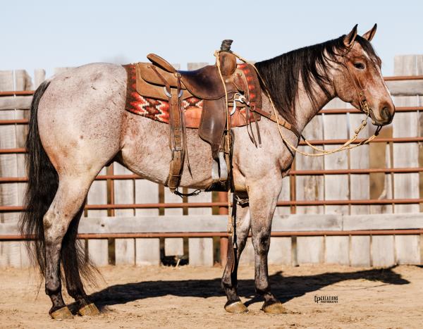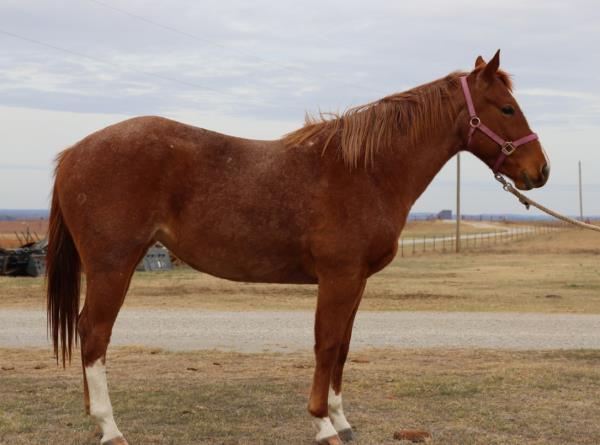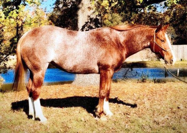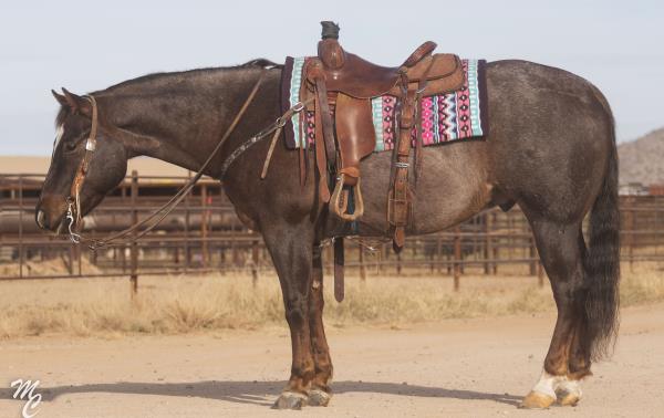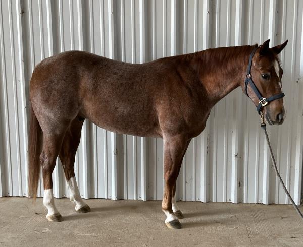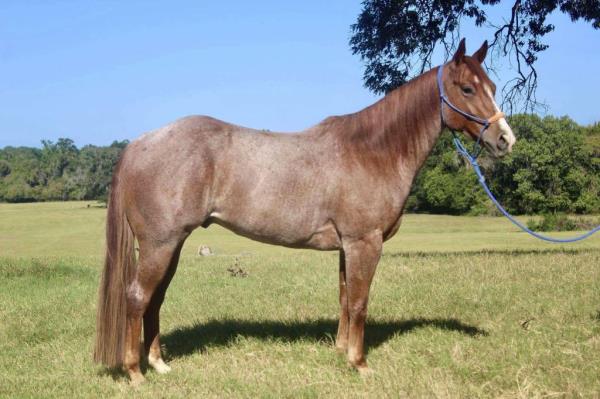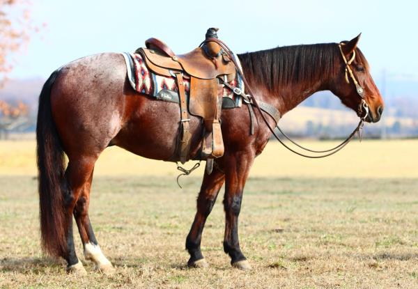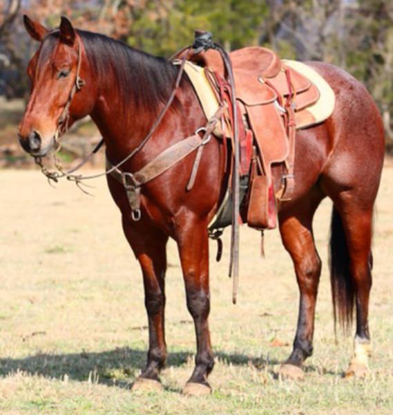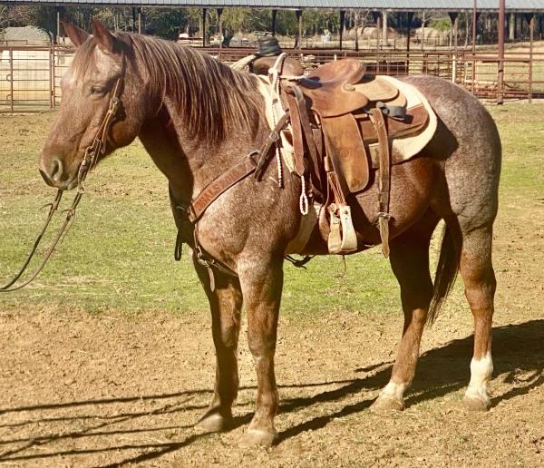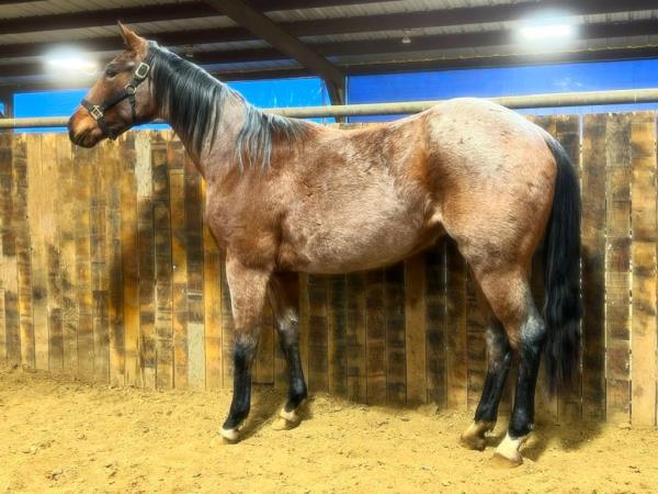 NOTES: "CB" is a nice, 4-year-old bay roan gelding that would make an amazing rope horse futurity prospect. He currently stands 15 hands, is gentle, friendly, easy to shoe, bathes, has no hump or buck and has plenty of heart and stamina. He has a solid start in the roping pen on the head side and hauled to some small jackpots. "CB" is no stranger to work. Has been used outside to gather, sort and doctor cattle, where he has proven himself to be a sure-footed hard worker but is pretty enough to turn heads when he goes to town. Will be shown in team roping preview.
