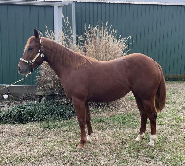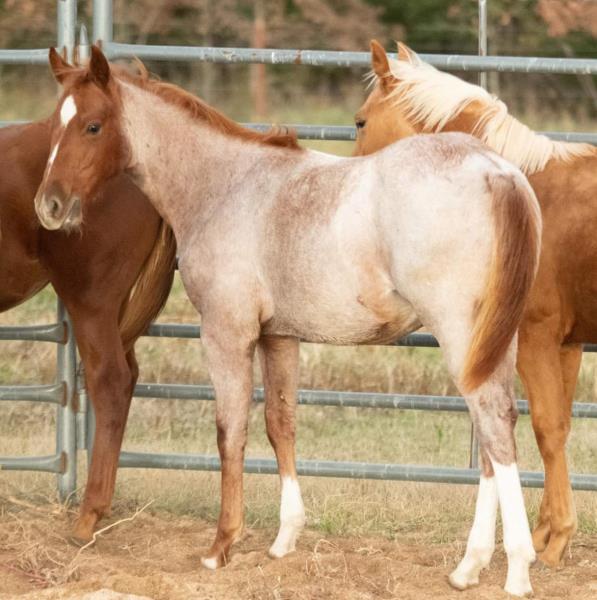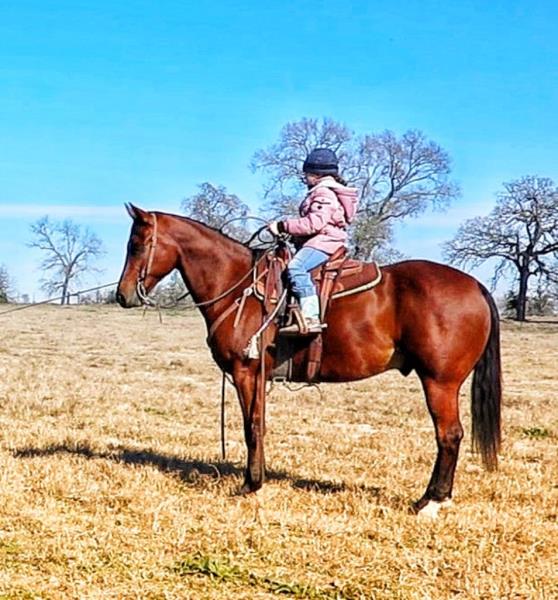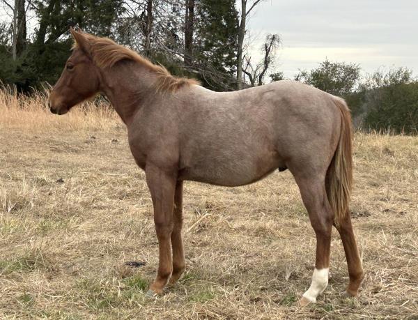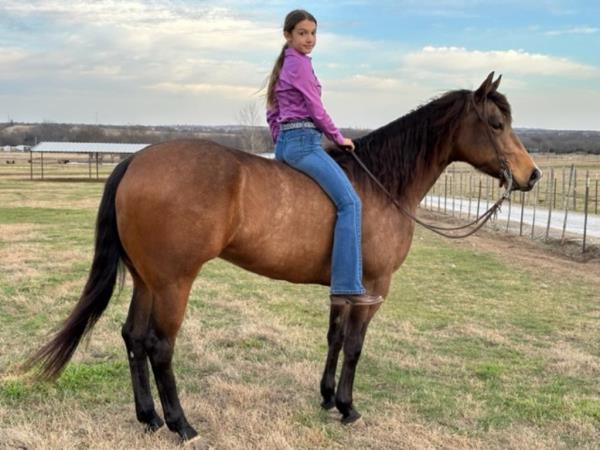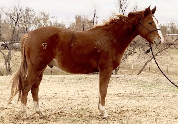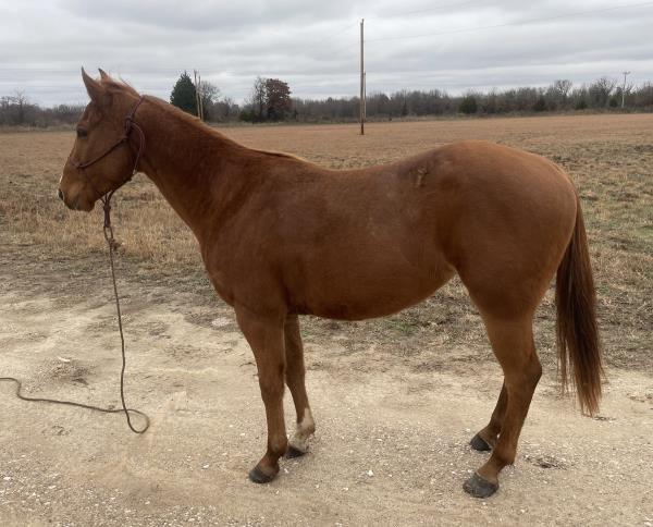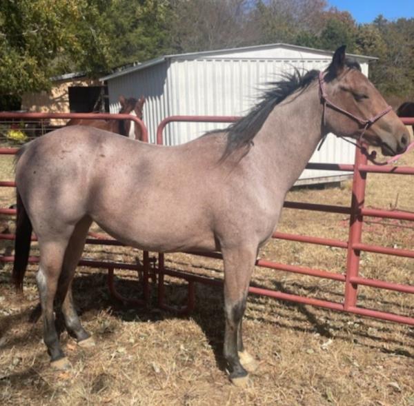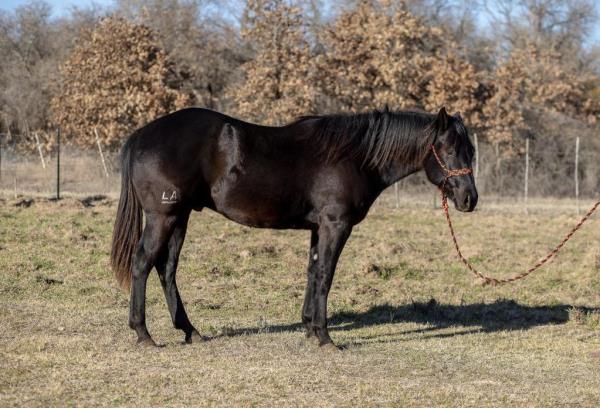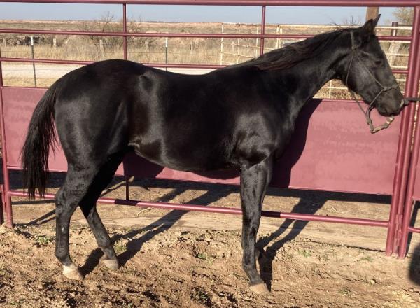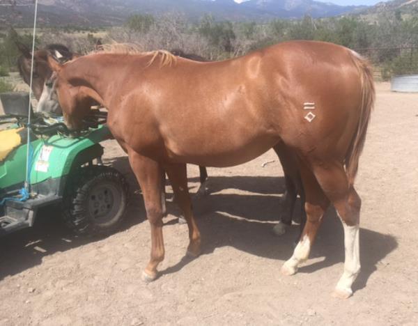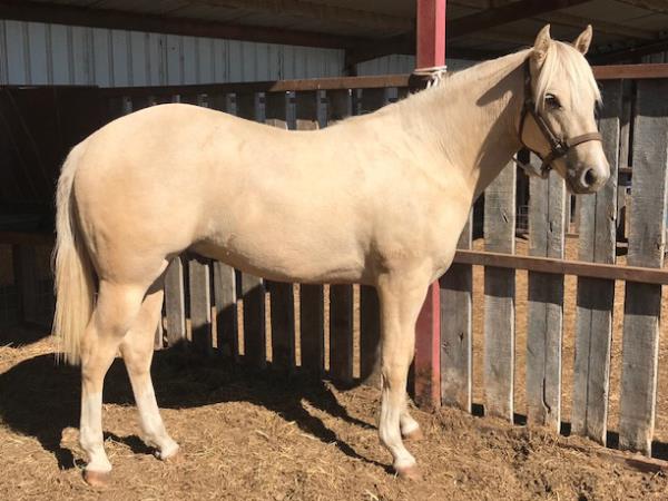 NOTES: This girl is a 3-year-old and stands 14.3 hands. She is a super sweet in-your-pocket filly with no kick, buck or bite. She has had a hard 50 days of riding and doing some simple ranch chores. An awesome ranch, roping or barrel prospect. Will be shown on cattle at the sale.