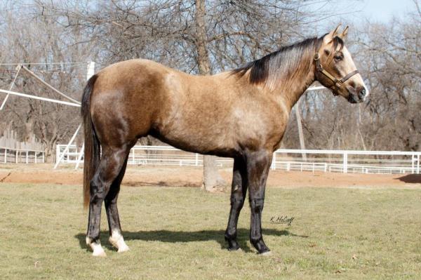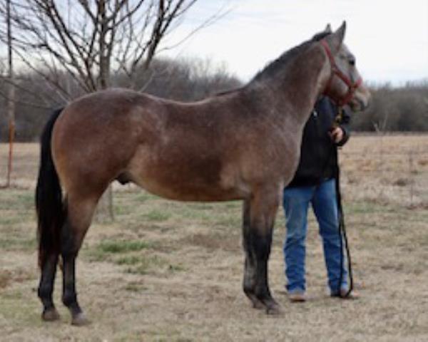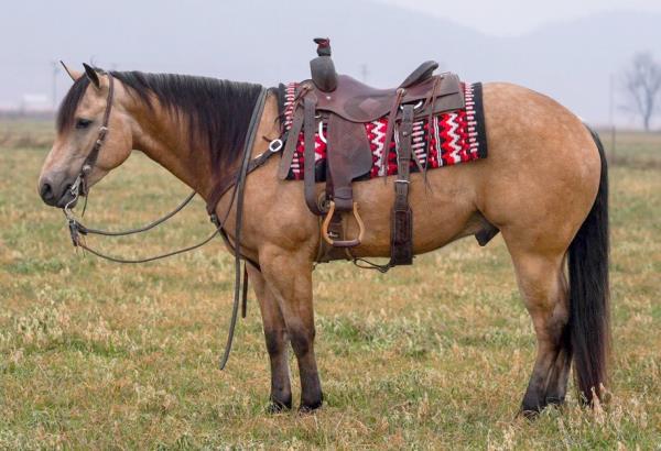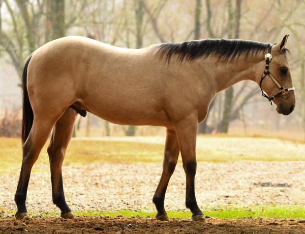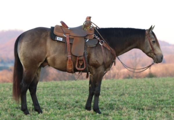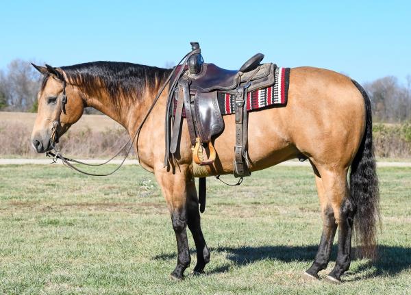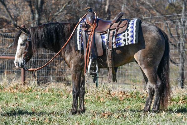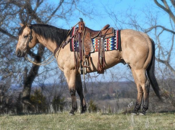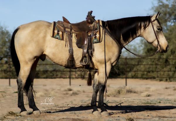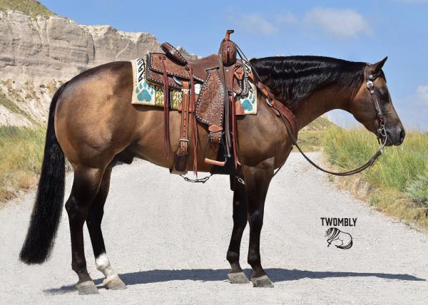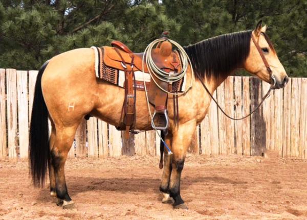 "Lobo" is a stallion of a lifetime! Take a look at this baby doll head and heavy build, round body and striking dark buckskin color. Stands 14.2 hands. Finished reining horse that is a blast to ride and easy to maneuver. Not only is he broke in the arena, but we use and ride him daily on the ranch and is a dream to ride down the trails. Has been used to move cattle in the hill and canyons. You never know he is a stallion by the way he acts. Our 4-year-old grandson can ride him. He has the best pedigree you could ever ask for, you could also build a business around "Lobo" breeding outside mares and your own mares. Will be shown in the reining/riding preview. Double registered AQHA & APHA. NRHA License. 5-Panel N/N.