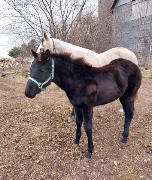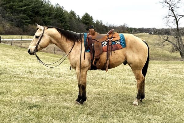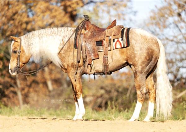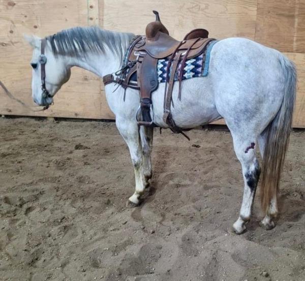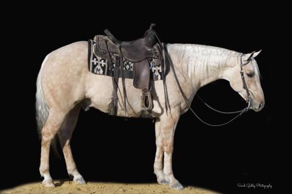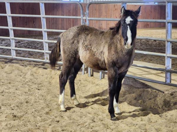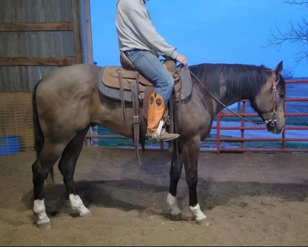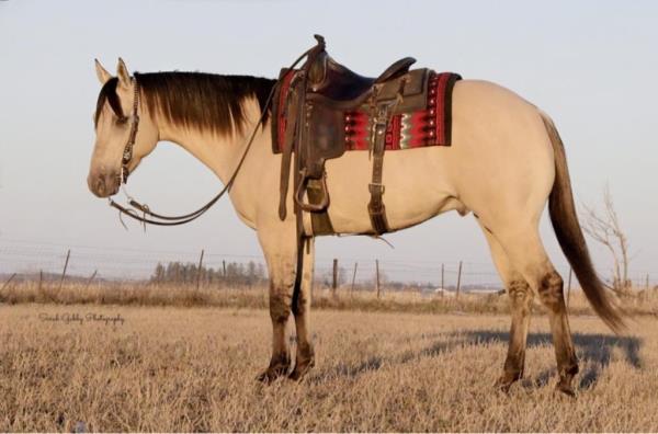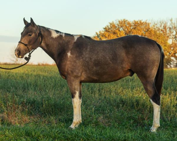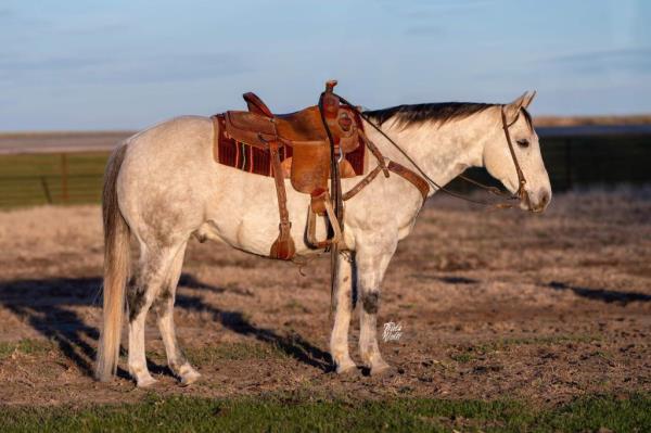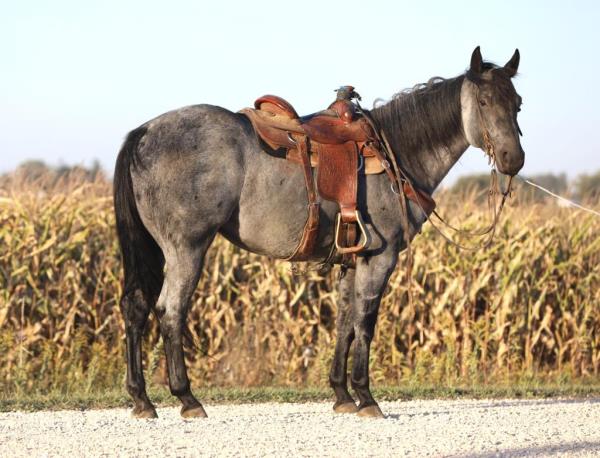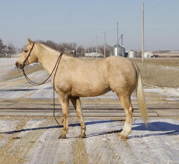 Good Honest AQHA Grullo colt with all the chrome you could ask for, He is weaned for 90 days and backgrounded right; halterbroke, vaccinated, wormed, on feed, handled, trimmed, loads, ties, bathes and is long haired enough to handle your midwest winter so buy without hesitation. Estimated height of 14.2 HH. I have ridden horses on both sides of this pedigree and liked them all. Easy to be around and very willing.