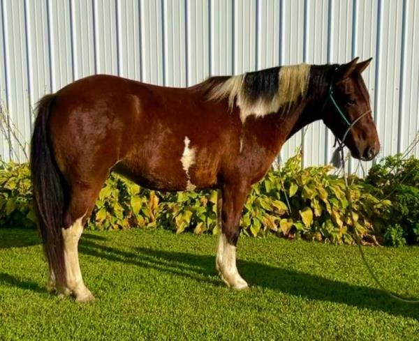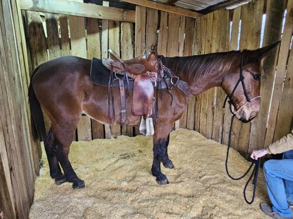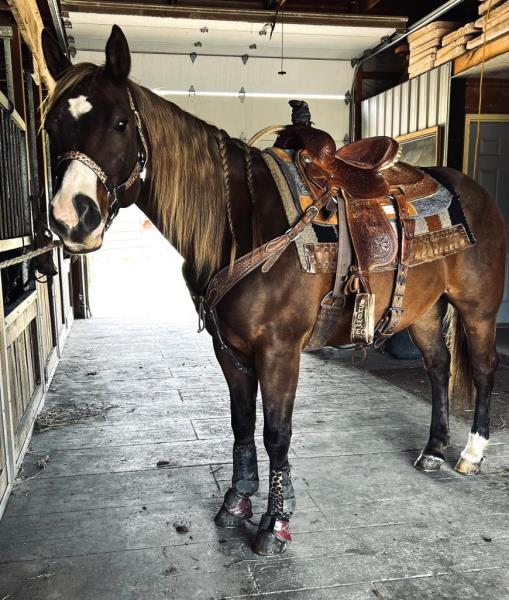 Bell is an amazing trail horse, will go over and through anything. Was used as a play day/4h event horse in her younger years. She is club footed on her right front foot.