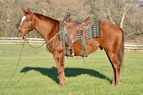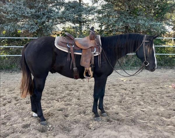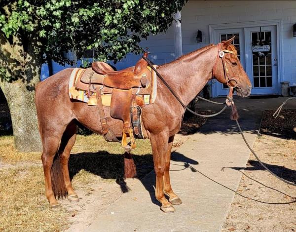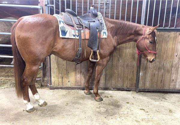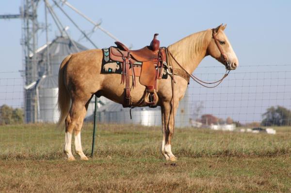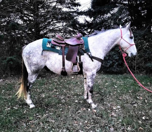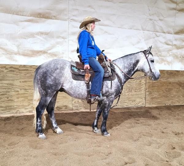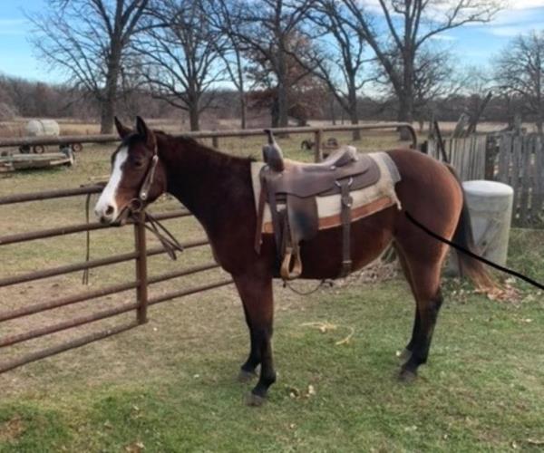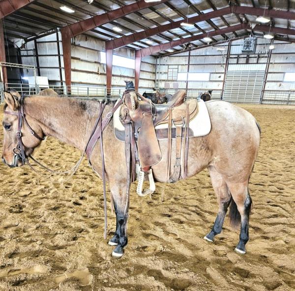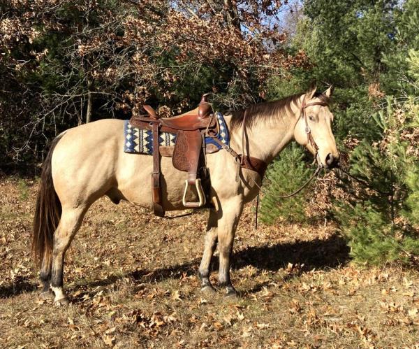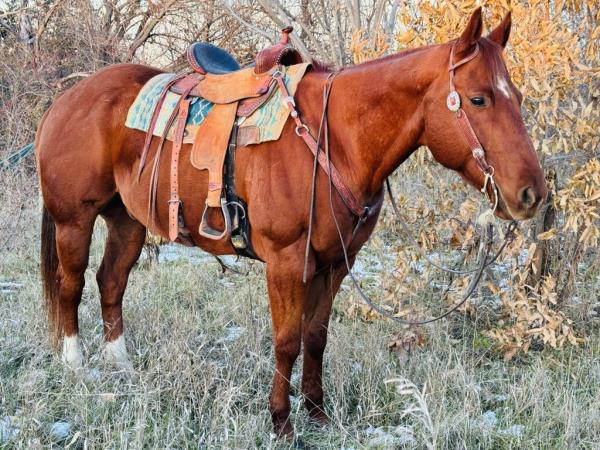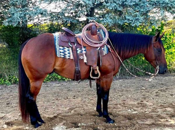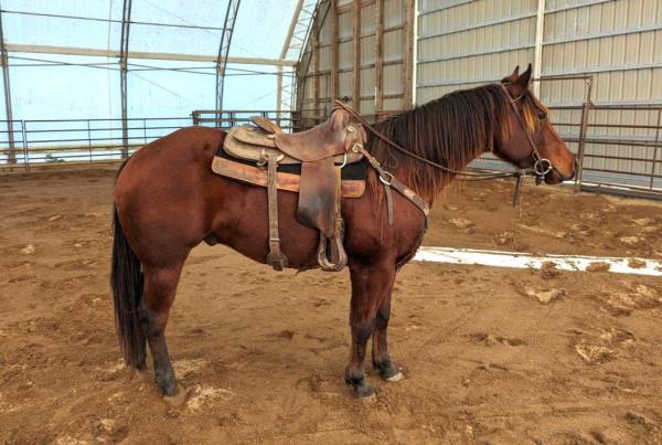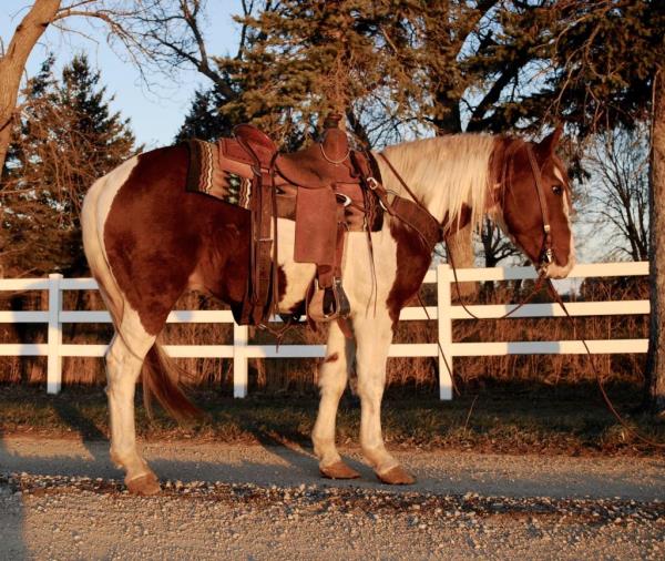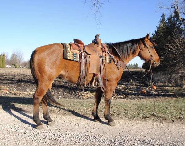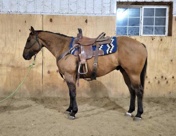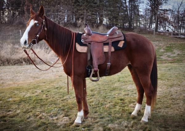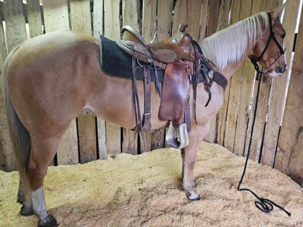 Very cute 15 hand mare 100% sound. Great trail horse not afraid of anything will go anywhere you point her. We rode her on the highway and thru tunnels in the Black Hills this summer. Handy mare with a one hand neck rein, backs really nice and will side pass.