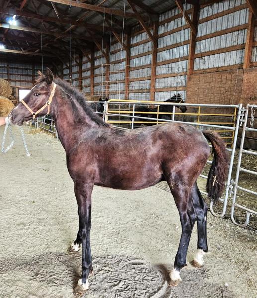 "ALLEE" is a real classy brown filly. Super kind and handy. Very willing to learn and, can go in any direction you need. Should mature 14.3-15 hands.