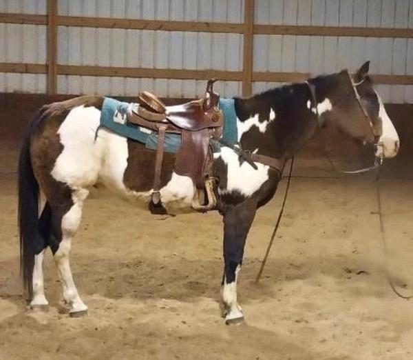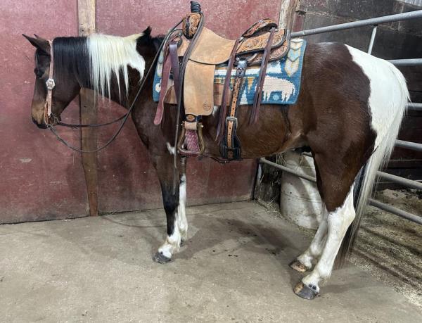 Apache is a thick made 15hh pretty paint gelding. He has been trail rode extensively over the last couple of years. He stands nice and quietly at the hitching post and crosses everything with ease. He has a nice neck rein and will move off of your leg nicely… he is super easy to ride. He side passes with ease and is soft in the face. He is an attention seeker and will meet you at the gate. He loads in the trailer, backs out and hauls quietly. If you're looking for a trail partner Apache is your man!