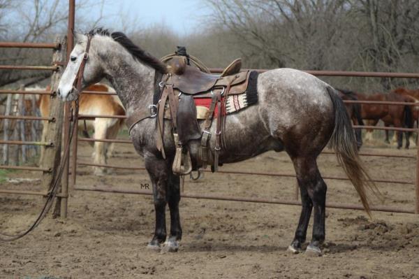 SON of CD OLENA – Spur is ready for a new home! Started in the cutting pen and used as a high-level sorter. Lightening fast, he will run down and rope anything in the pasture. Used the majority of his life on big working ranches, he has been ridden by every level of rider - checking cows, gathering, doctoring, roping, sorting, and used for leisurely trail rides. Spur will cross creeks, step over logs, bang through brush and stay calm, cool and collected doing it. Stands to be saddled and for the farrier, ties, leads, loads, and bathes. If you want a show stopper that will out work anyone - Spur is your man! 14.1 hds. (816) 661-9899