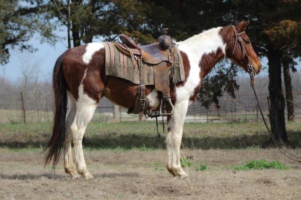 Spot has been used out in the pasture. He lopes circles and has roped some slow steers. He should make someone a good using horse. He is out of good stock - never registered, but by a grandson of TR Dual Rey and out of a paint mare. 15 hds.