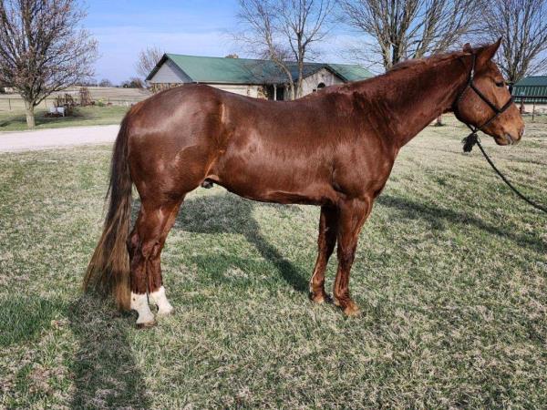 Big, pretty mare. Very well made for a riding horse. Good mover. Will ride and drive double. Good natured and has unlimited potential. (417) 316-0023