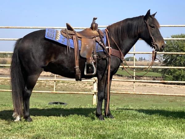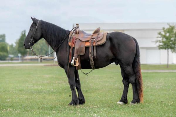 Fritzie is a Friesian x Dutch Harness cross that's broke to ride and drive. Gentle and well mannered, easy to catch, bathe, and clip. Been primarily used as a reliable trail mount. Stands 16.3 hands tall and is safe for the whole family. He is kind and quiet for anyone looking for a solid, all-around partner.