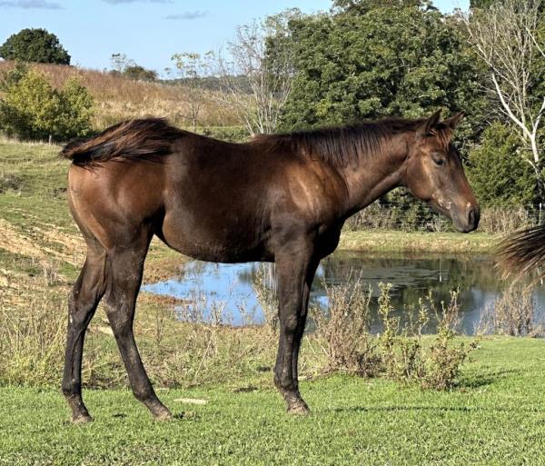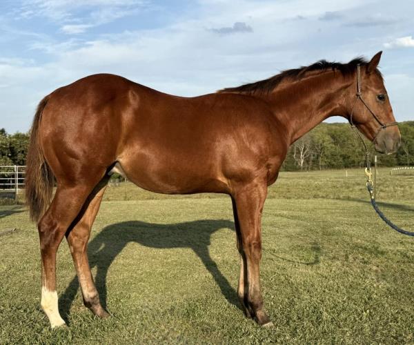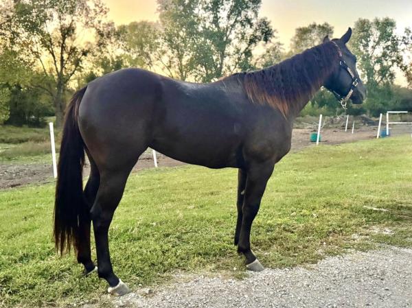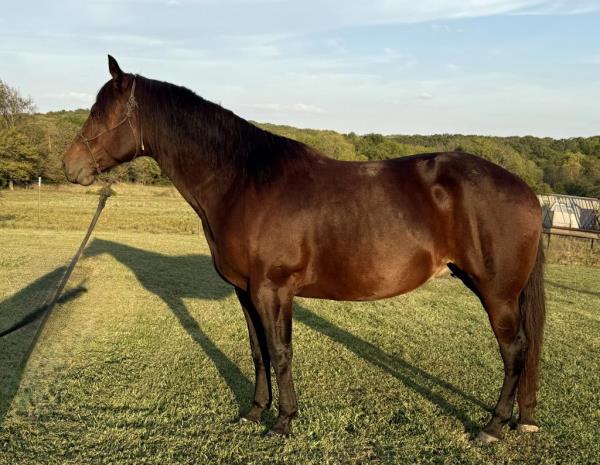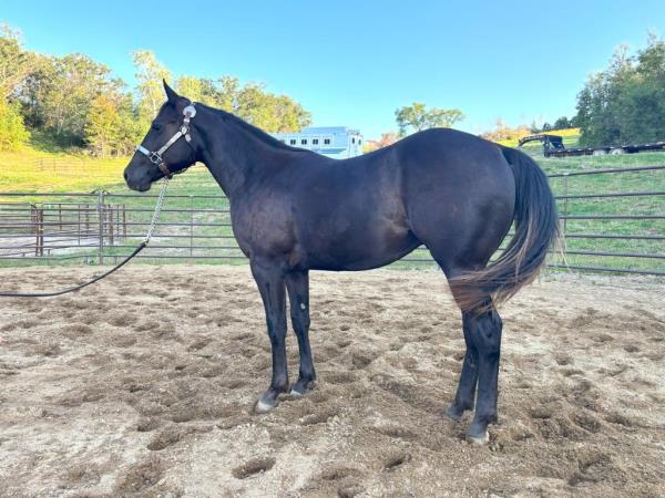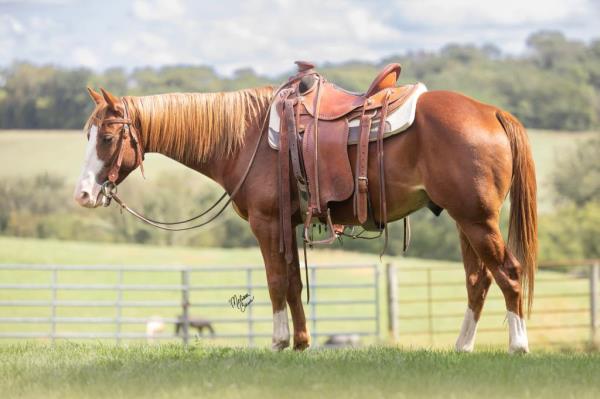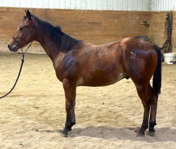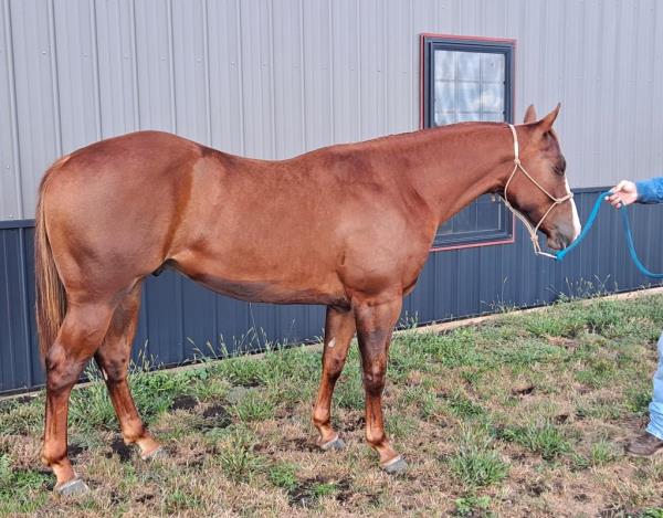 Was started as a 3 year old and ridden on trails and around the farm. Was purchased as a broodmare prospect and she took first try via live cover, had no issues foaling and was a great mother. Her 2025 colt is in the sale as well. We started her back to riding after the colt was weaned and she is doing fantastic. She is a very gentle sweet mare. She does have conformational flaws in her hind legs but she has always been sound. FMI (417) 770-8584