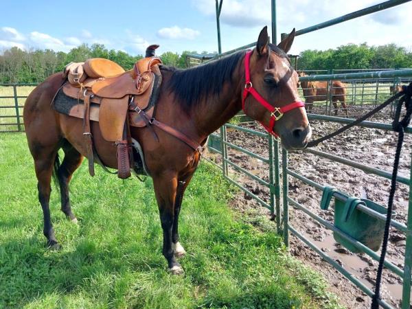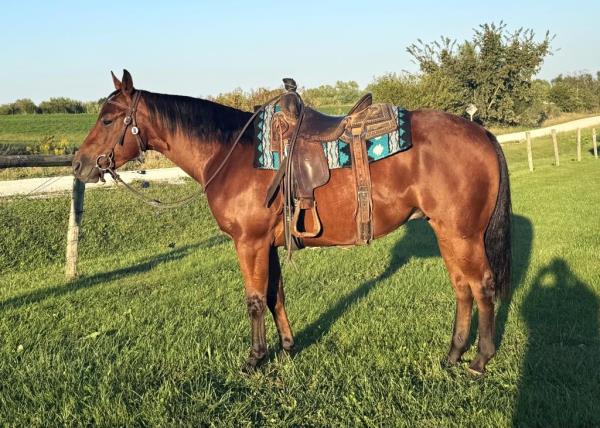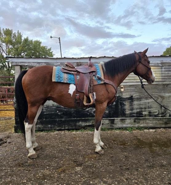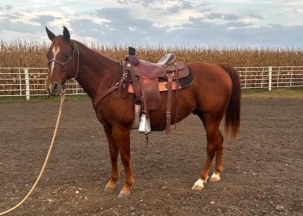 Poco is an all around type of horse. He stands 15 hh, gelded. We have doctored calves in the pasture, drug cows, sorted wild horses. My daughter runs barrels and poles on him in youth rodeos. This horse will do it all! FMI (515) 468-1613