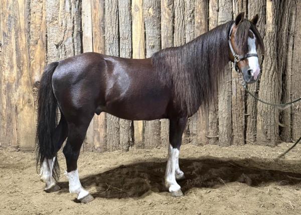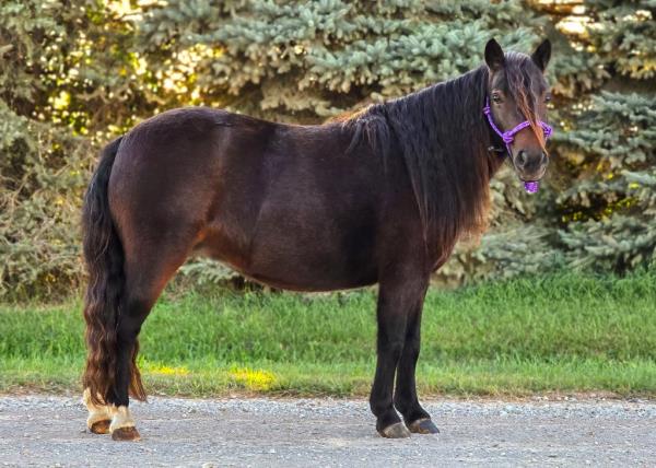 Prince Albert is a 50-inch Hackney/Quarter Horse cross gelding pony that has been shown in everything from walk-trot, western and English pleasure, and driving classes to halter. He is a beautiful liver chestnut with four white socks, an extremely long mane and tail, and plenty of style. Prince Albert is very classy, super gentle, and broke to drive both single and double. He is traffic-safe and has been around all kinds of farm animals. This pony is truly unique—perfect for 4-H, trails, or show. FMI call (319) 721-7714