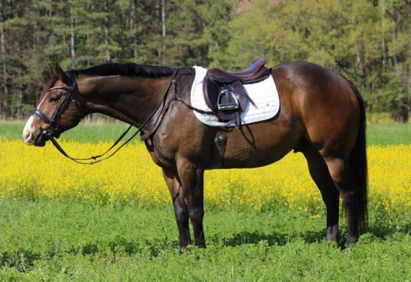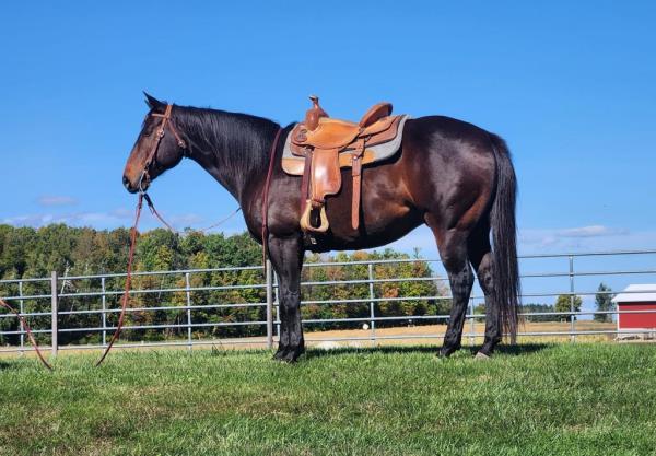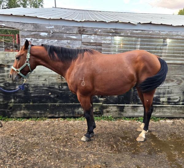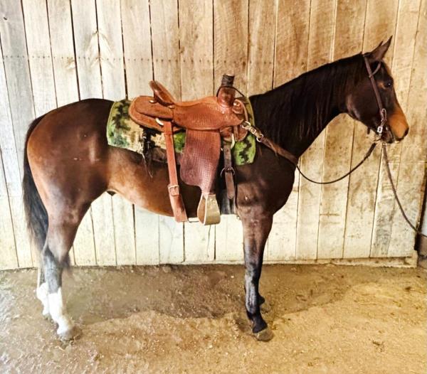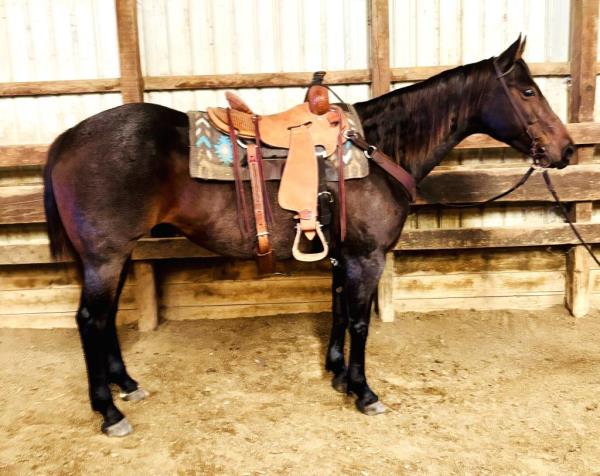 Ranch broke, drug calves at the brandings, pasture roped off of. He's been ridden by various types of riders. Came off a big ranch in Saskatchewan Canada.