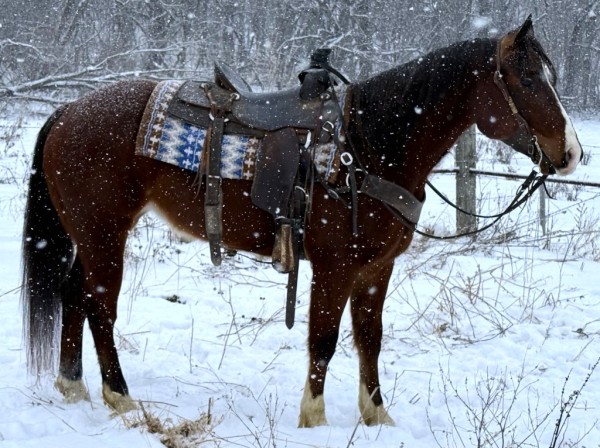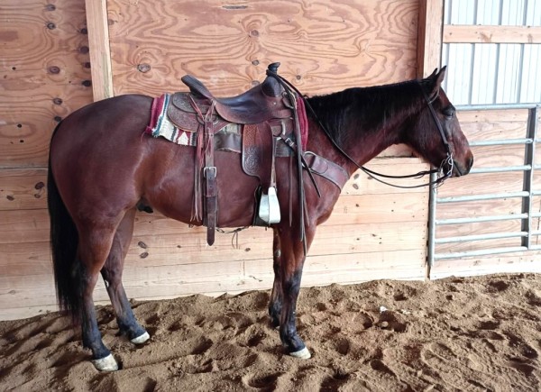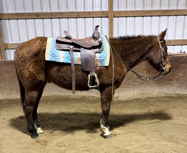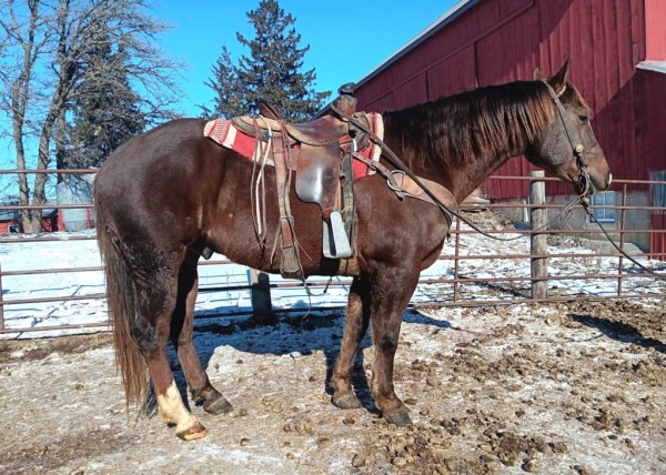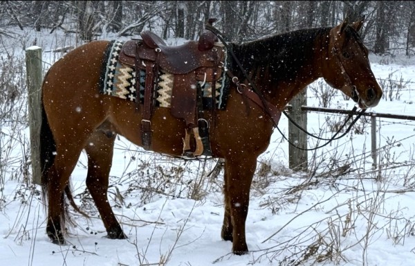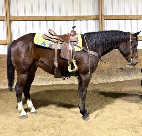 “Teddy” is a 14 year old bay Gelding. Teddy is a very kind and gentle gelding standing around 15.1 hands. Teddy has been extensively trail ridden and has lots of experience in an arena. Teddy rides very collected, has a slow and smooth trot and knows his leads. He goes wherever you point him and is very willing to please. Teddy is easy to catch, handle, and load. FMI (641) 485-5058