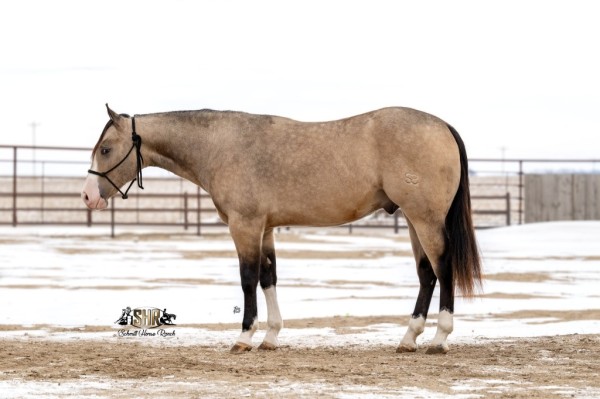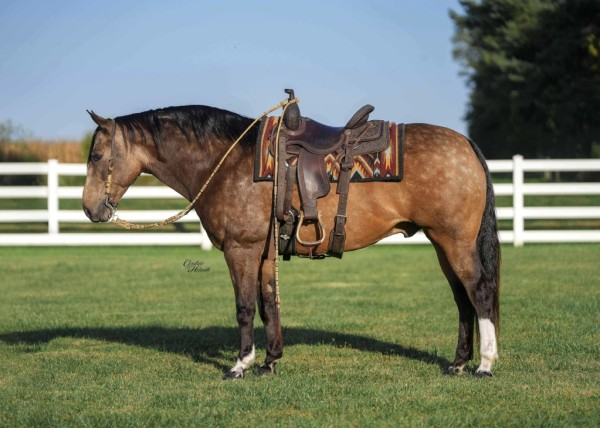 Absolutely stunning buckskin stallion by Epic Titan (Clinton Anderson’s exceptional stallion with NRHA LTE of $13,749). Out of a daughter of Shiners Voodoo Doctor (NRHA LTE $87,098), an AQHA Open Arena ROM Reining earner and NRHA $5.9 Million Sire with over $6.8 Million in total progeny earnings.