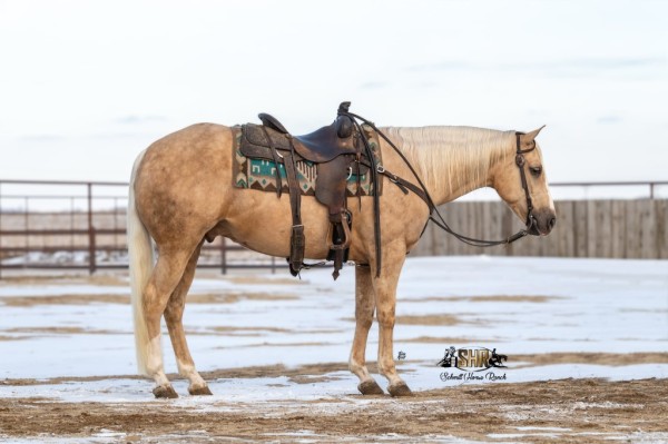 Here is a three year-old ,14’3 Palomino filly, a granddaughter of the great Metallic Cat!!Who is both the leading sire of working cow horses, and cutting horses, and also throw in a little Playgun for good measure. She has lots of shape and refinement and great disposition deluxe.! This mare has been ridden a lot as a two-year-old outside, down road and anywhere you want to point her she’ll go then lots more riding as a three year-old. Fitted by NoahRay GingeRich!