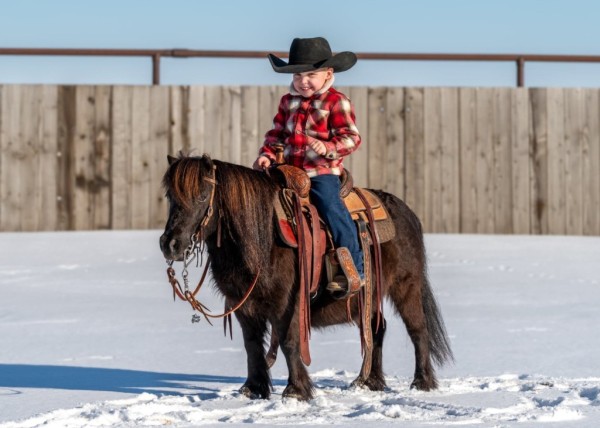 Midnight is a cute black pony gelding that Clayton has had a lot of fun riding. He steps out willingly and goes exactly where Clayton—at just 4 years old—asks him to go. This little guy is well desensitized to all the typical kid shenanigans, including toys, tarps, sacking out stick, and just about anything else you can imagine.