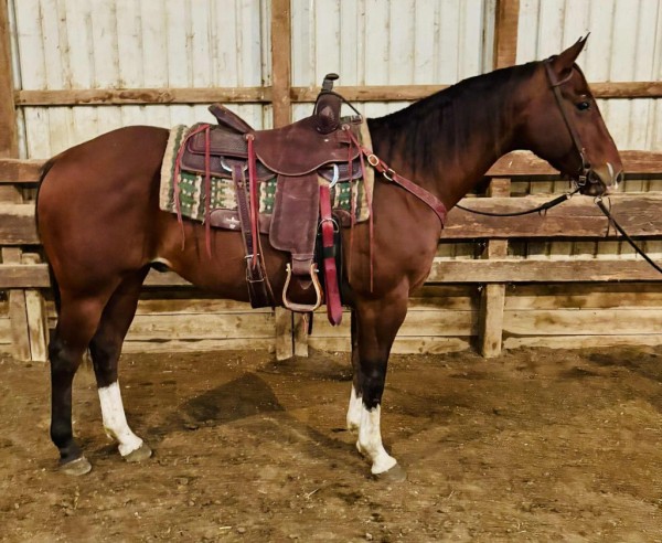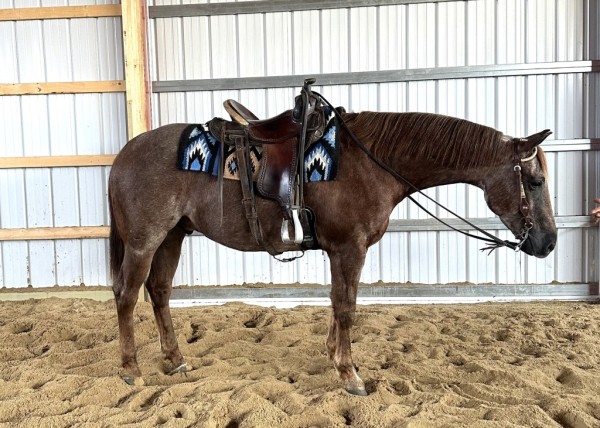 Four year-old great looking gelding with old-time bloodlines. Line bred Pretty Buck, Blackburn, and Poco Bueno! He’s been ridden lots, up and down roads, in the arena, wherever u point him! His pedigree shows lots of AQHA money earners and point earners! Fitted by Noah Ray, Gingerich, Minnesota.