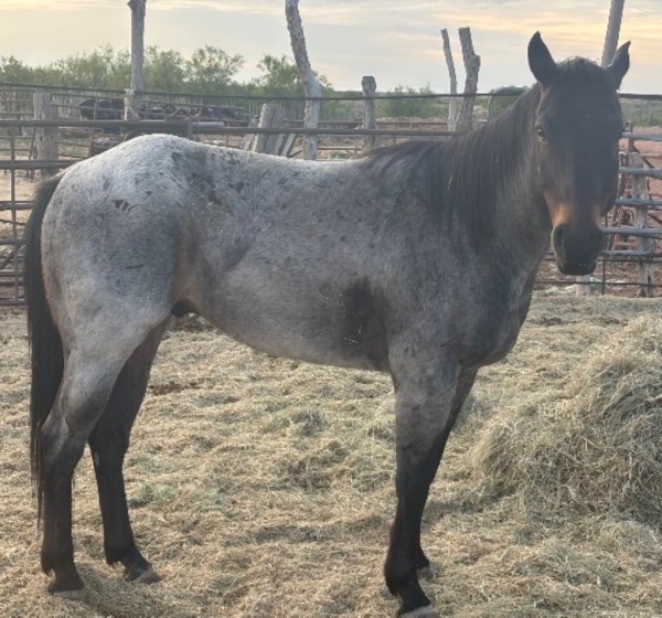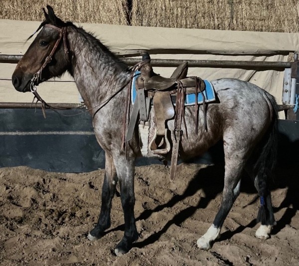 Ms Little Red Hood is bay roan mare. No papers. Blood lines are top side Rowdy Blue Man and bottom side Two Eyed Smart Blue Valentine. 4 years old and stands 15.2 hands. Experience riders. Has had 2 months of work. She has been working good. She’s a young mare with a lot of energy. Ready to learn a lot. A lot of future. She will make a great working horse on the ranch, rope, cattle, or trail ride her. Make her as you like and breed her later.