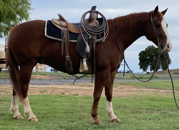 RED RIVER RATTLER is a 2017 chestnut gelding. He has been used as a head horse. He has been hauled to some shows. He has some buttons to him, rides really smooth and low headed. Real gentle. Great with the farrier. He has been used as a trail horse for the past year in the hills of Oklahoma. He is being sold to no fault to his own. Selling as sound and ready to go back as a rope horse or take on some more trails! Stands 15 hands. His sire is CHICS BOLD ROOSTER, Son of SMART CHIC OLENA, $167,471 and 65 AQHA points;NRHA Open Reserve World Champion; AQHA World Champion Senior Reining Horse;, AQHA World Champion Senior Cutting Horse;, AQHA High Point Cutting Champion;AQHA High Point Senior Cutting Champion. Sire of 1,139 money-earners, $15,474,266, and earners of 31,838 AQHA points, including SMART SPOOK ($405,080 and 80.5 AQHA points: NRHA Open Futurity Champion; NRHA Hall of Fame, Superior Reining), OLENA OAK ($381,390 and 193 AQHA points: NRCHA World's Greatest Horseman Open Champion twice, Superior Reining), SMART CHIC AN TARI ($336,565: 4th NRCHA Open Futurity), CHICS MAGIC POTION ($321,138 and 150 AQHA points: NRCHA World's Greatest Horseman Fence Work Champion; NRCHA Hall of Fame, Superior Working Cow Horse). His dam is GLH BOBBI O LEA Maternal grandsire is JAC PIC A NIC, $85,984 and an AQHA point-earner: NRHA Open World Champion Stallion; NRHA Int. Open World Champion; NRHA Int. Non-Pro World Champion; NRHA Open Reserve World Champion; South Country Reining Open Derby Champion. Sire of 24 money-earners, 14 AQHA point-earners, including PIC A MELODY ($15,825: 4th Revolution Barrel Racing Denton Qualifier Open 3D), DOLLS FILLY NIC ($9,413: Canadian Breeders Classic Reining Derby Limited Non-Pro Reserve Champion), PIC BY ELVIS ($6,204 and 12 AQHA points: Canada Le Futurite Boisvert Reining Open Co-Champion).