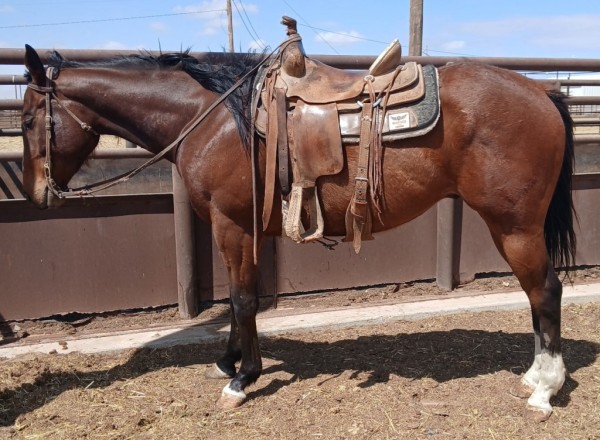 Lucky is a 6 year old bay gelding standing 15.2. He has been used extensively for all kinds of ranch work. He has had a lot of stock roped off of him in the pasture and will track one well and pull strong. He has good feet and handles the rough, rocky, brushy country well. He is a big boy with a lot of go and can be spooky about new things, but nothing to bad. He is also lightly started on the barrels. His sire is SPECIAL FRENCH BULLY; sire of 7 money-earners, including RONAS FRENCH BULLY (3rd Texas Freedom Run Barrel Racing Open 3D), SPECIAL FRENCH BUGS (Glenwood Memorial Barrel Futurity Round 1 2D Champion), COLONEL FRENCH BULLY (3rd CTBRA Barrel Finals Day 1 Open 5D), BULLYS FRENCH JUDY (P) (7th C-M PRODCTNS Barrel Racing New YEARS Bash Day 1 Open 4D). Son of BULLY BULLION SI 104, Champion Racing Aged Stallion; New Mexico High Point Aged Racing Stallion, 10 race wins, $225,384, won Oklahoma Derby - Fall Div [G3], All American Gold Cup [G1], Mr Jet Moore Stakes; sire of 431 money-earners, $3,397,797, and earners of 2,330 AQHA points; 538 Race ROM, 40 stakes winners, $12,321,382, including BULLIONS N GARTERS SI 105 (19 race wins, $482,726), SHAKE THE BANK SI 105 (Champion Racing 2-Year-Old Filly, 14 race wins, $372,585), BULLET BULLION SI 107 (8 race wins, $219,999), CASINO BULLY SI 113 (13 race wins, $215,225), BULLISA SI 105 (12 race wins, $188,087). His dam is STREAKS WORTHY DASHA Maternal grandsire is DASHS DREAM STREAK SI 101, 2 race wins, $10,189; sire of 7 money-earners, including STREAKS MUSIC (P) ($27,798: GTBRA Barrel Racing PERRY Cup Slot Open 2D Champion), STREAKS MITY IZZY ($10,627: top 10 BBR World Barrel Racing Qualifier Day 1 Open 3D), STREAKS HOLLY TREE ($5,040: split 4th NBHA Youth World Barrel Racing Qualifier Round 2 Teen Youth 2D), STREAKIN SAM ($4,305: 3rd Indian Creek DUELING DRAGONS Barrel Racing Open 3D), MR RIVERS (finalist Barrel Bash Topeka September Day 3 Open 4D), STREAKS STONEY MARBLE (P) (4th Barrel Bash Buckeye March Day 2 Open 4D).
